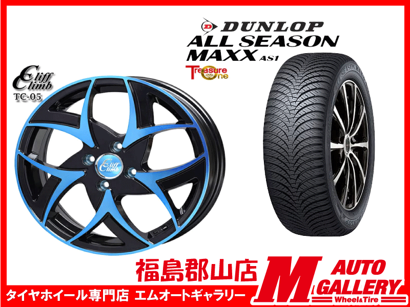 郡山店★オールシーズンタイヤホイールSET★クリフクライム TC-05 BLUE 15インチ 5.5J 4H100+43&DL オールシーズンMAXX AS1 195/65R15 91H