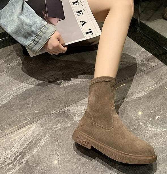 レディース 靴 ブーツミディミドル ショート ラウンドトゥ フラット ぺたんこ 黒 カーキ 25cm 22.5cm(35) 黒