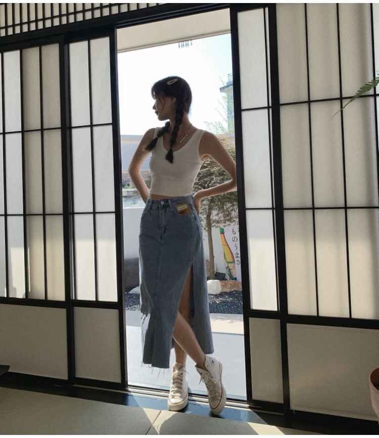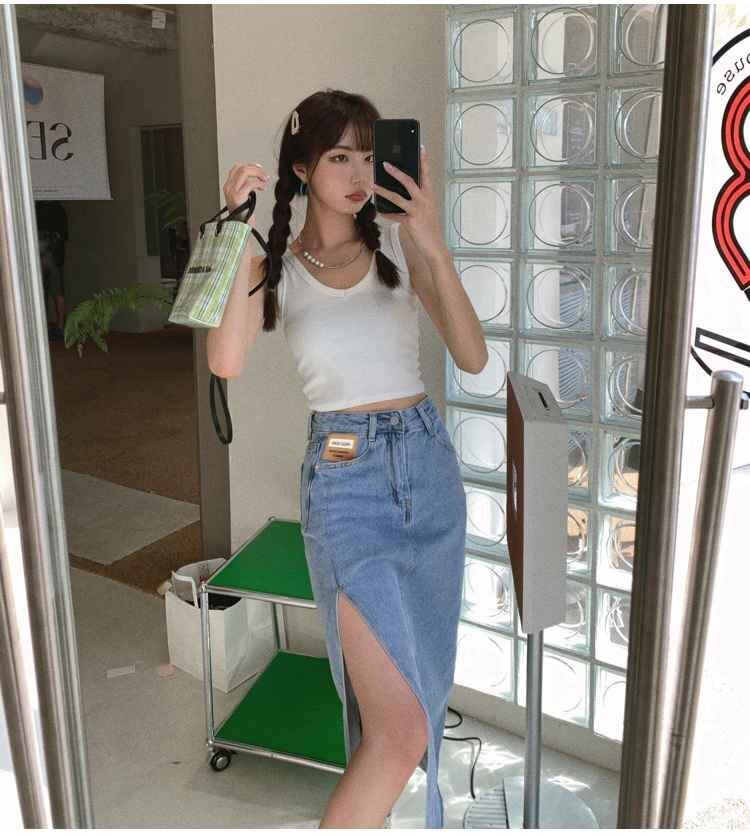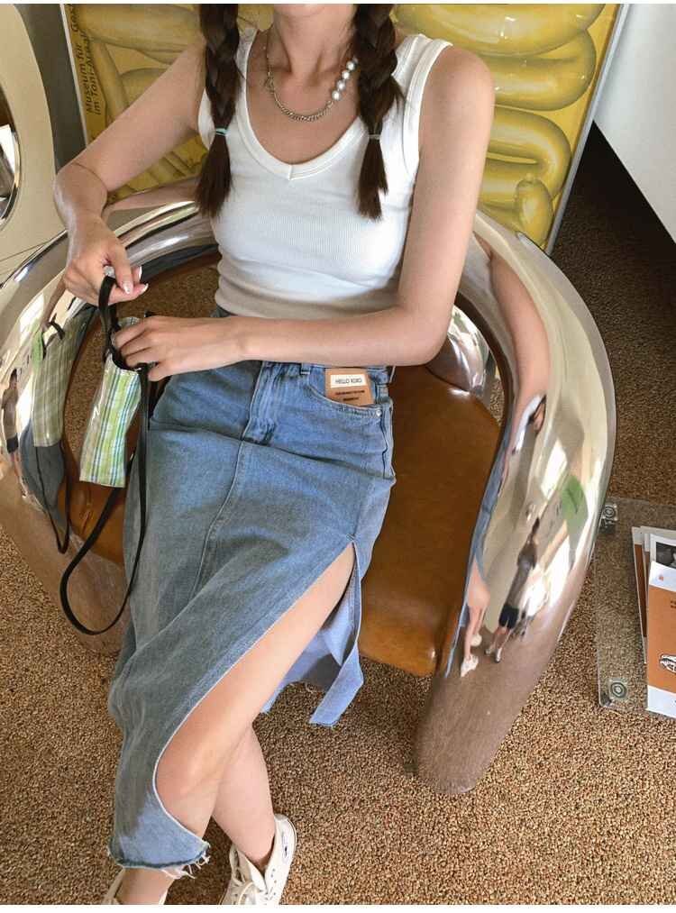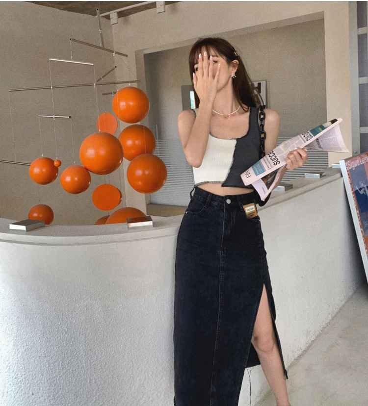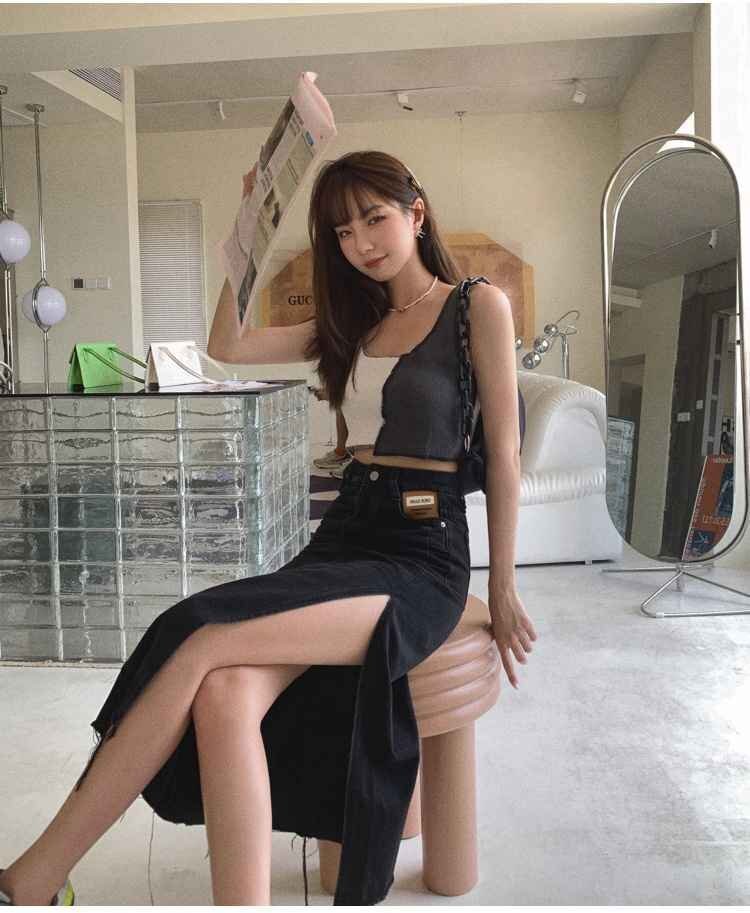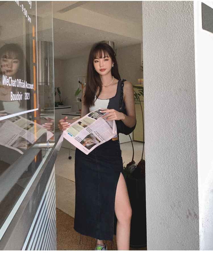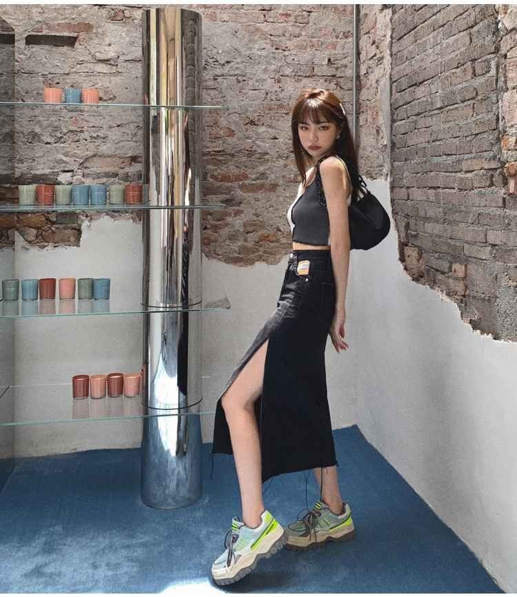 シンプル スプリット Aライン デニム スカート カジュアル 夏 2XL ブラック