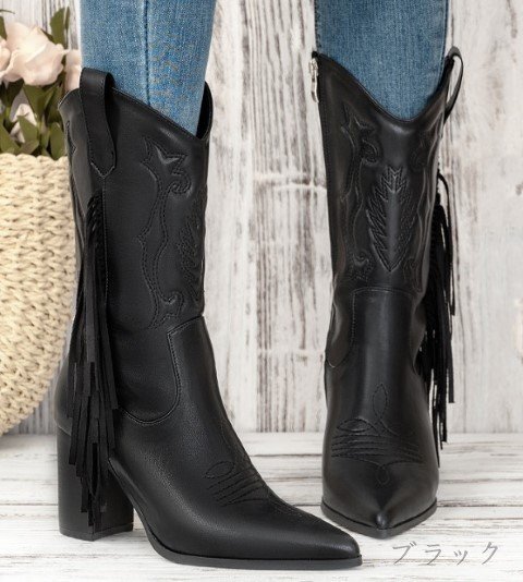【高品质】全3色 ブーツ 太いヒール とんがりトゥ フリンジ シンプル 42 ホワイト
