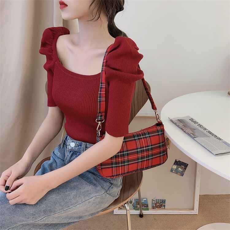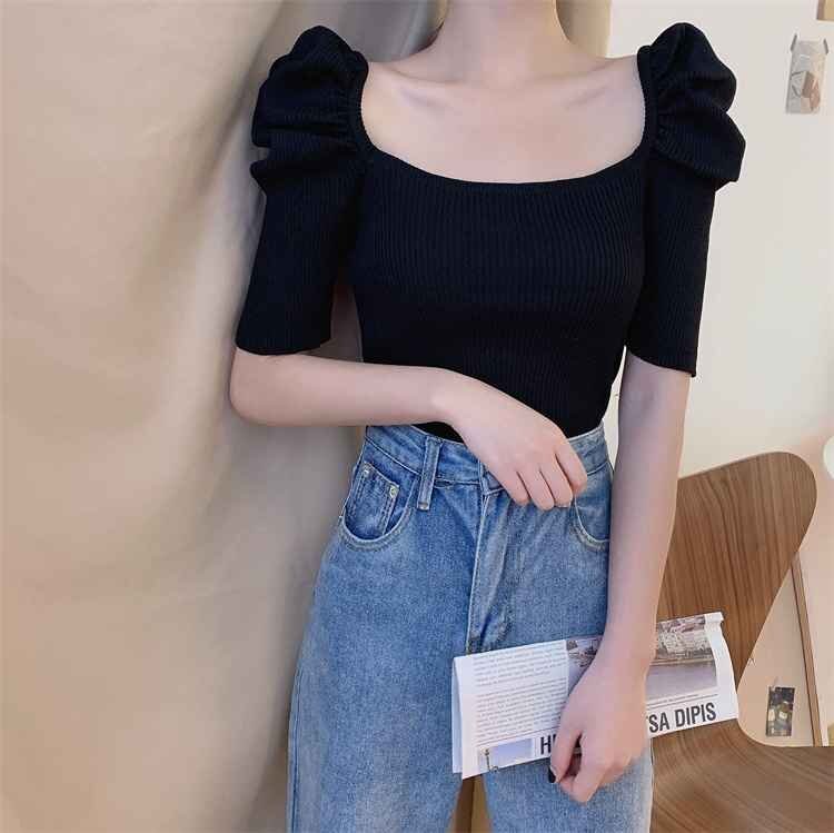 ニットトップス 半袖 パフスリーブ レトロ かわいい系 スクエアネック レディース L ワインレッド