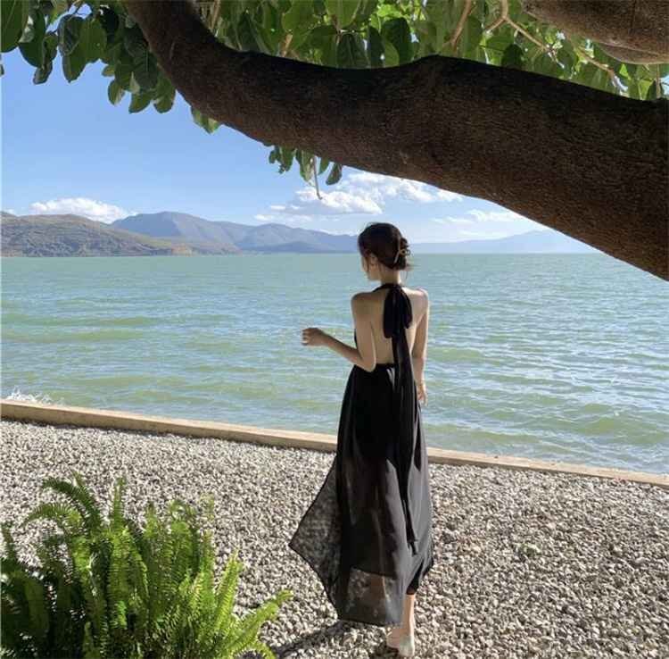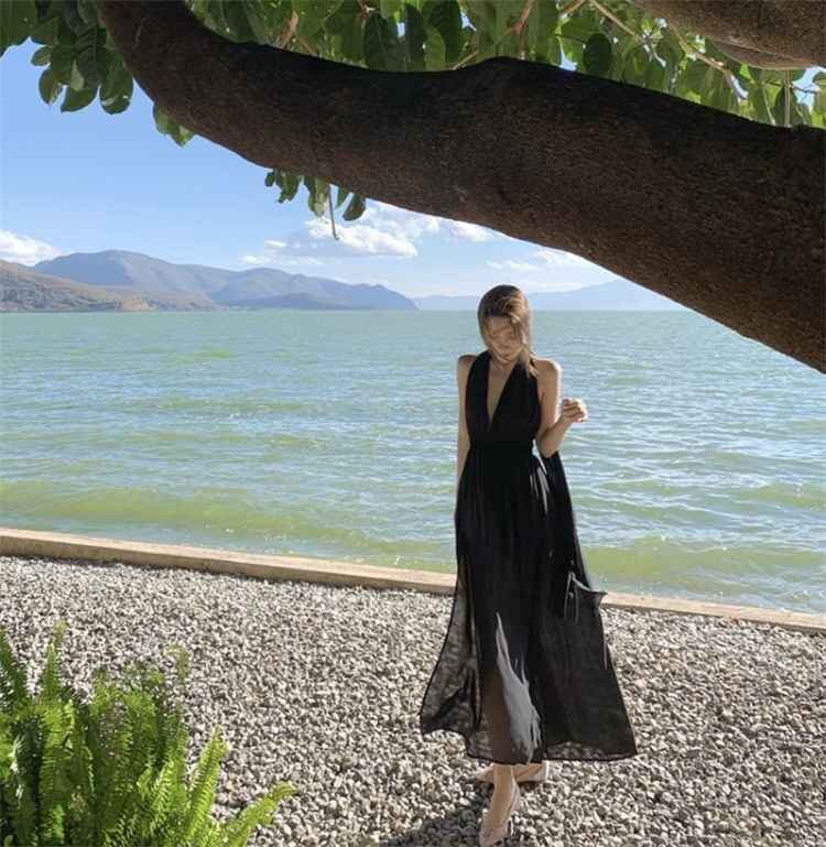 ロングスカート シフォンドレス ビーチドレス 休暇 Vネック S ブラック