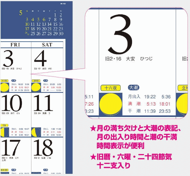【即决】カレンダー 2026年 壁挂け 月暦 NK169 令和8年 月 満月 新月 月の満ち欠け 月齢 満潮 干潮 潮汐表 壁挂けカレンダー