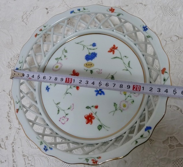 (☆BM)有田焼/畅山 作 菓子器⑥陶器制 透かし细工 直径24.5㎝ 菓子鉢 色絵 染锦 花纹 笼 深皿 饰り皿 编み细工 バスケット 果物/小物入れ