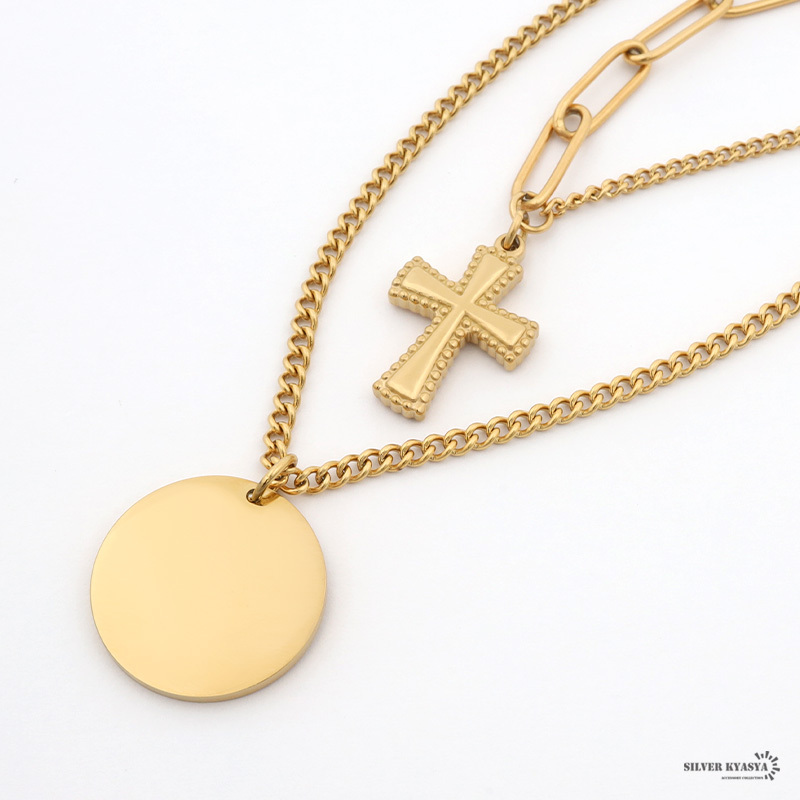 ダブルチェーンネックレス ステンレス 18k 金メッキ ゴールド 二重ネックレス 2连 金属アレルギー クロス 十字架 コイン