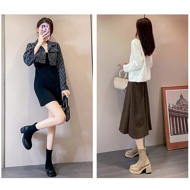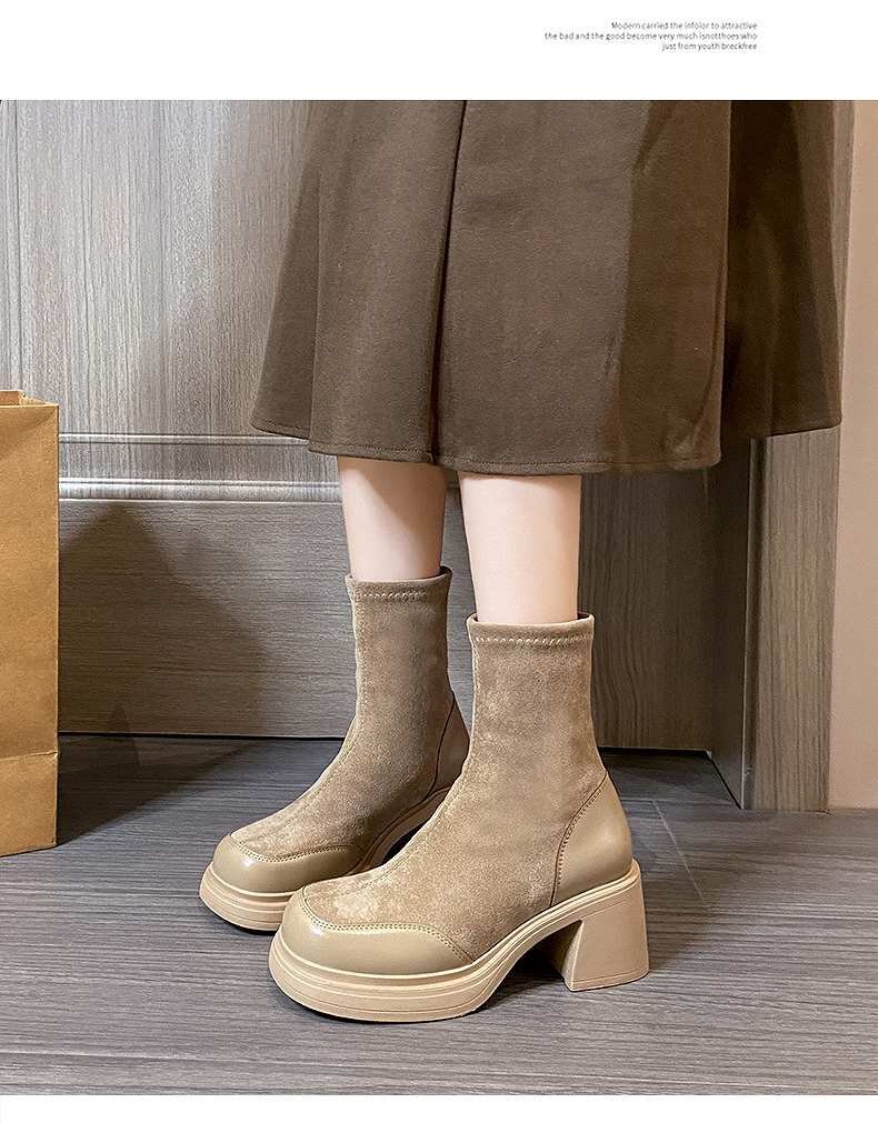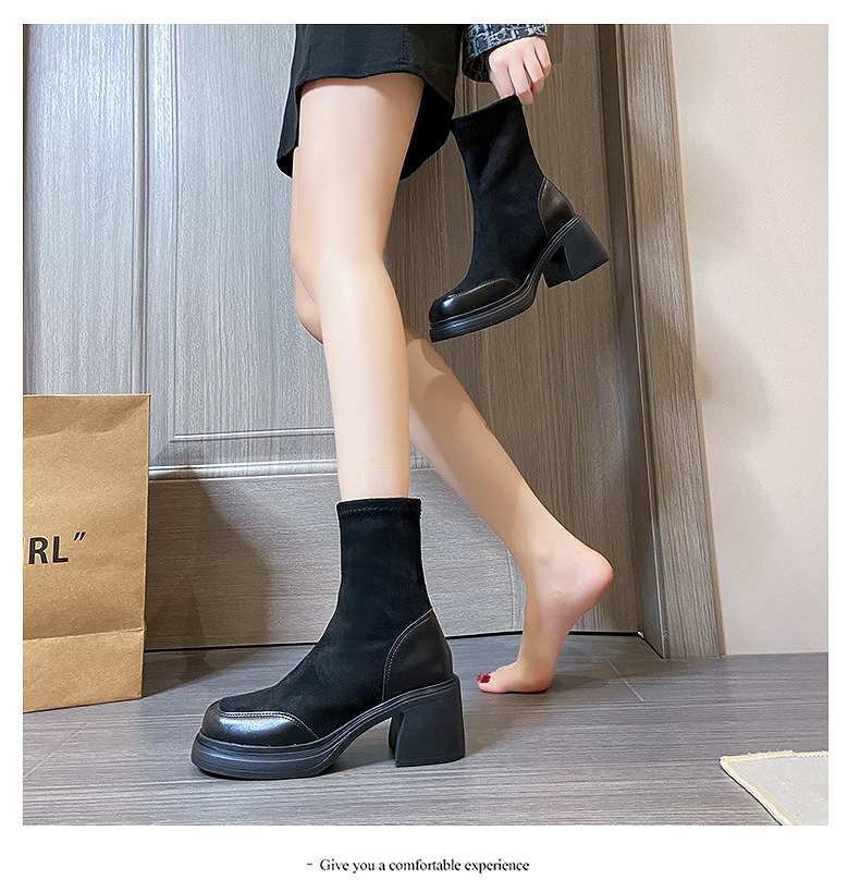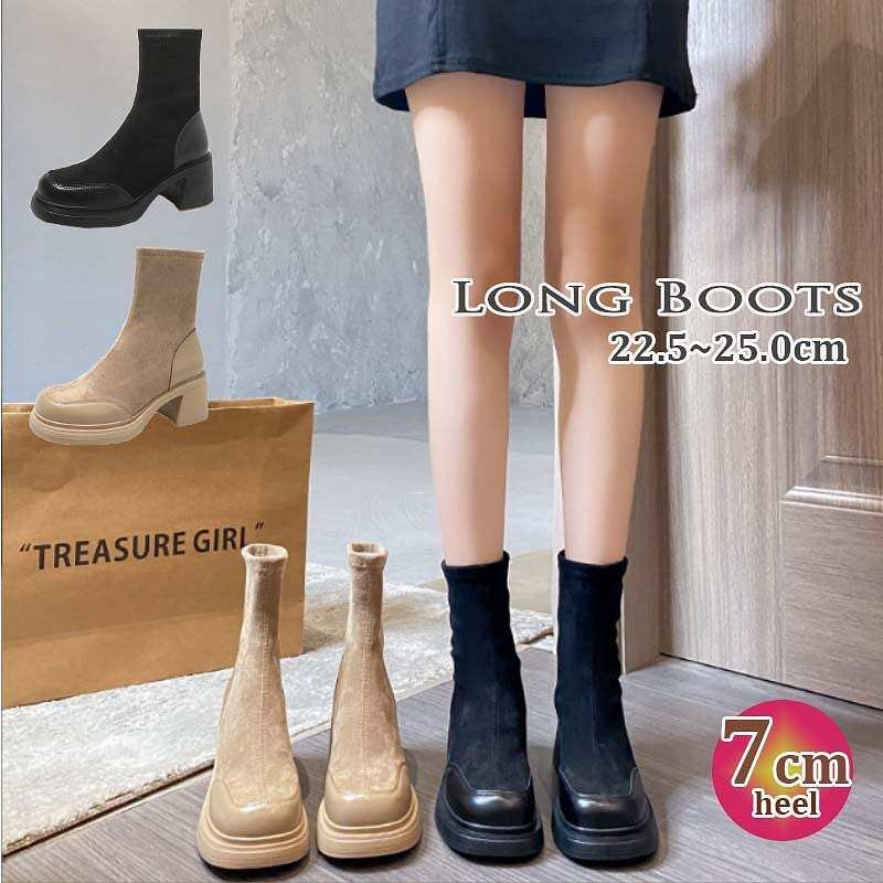 レディース 靴 ブーツ ミドル ラウンドトゥ スエード调 厚底 脚长 スタイルアップ 黒 ベージュ 24.5cm(39) 黒