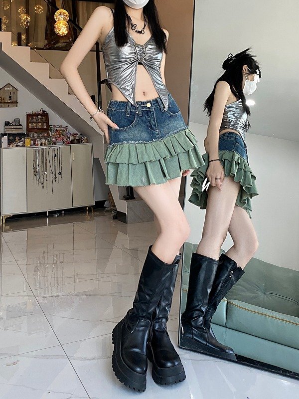 デニムスカート フリル 切り替え バイカラー デニム sweet系 S ダークブルー