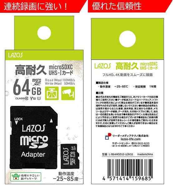 高耐久micro SDXCカード 64GB UHS-I CLASS10 U3 V10 100MB/s ドライブレコーダー アクションカメラ対応 L-B64MSD10-U3V10 LAZOS ラソス